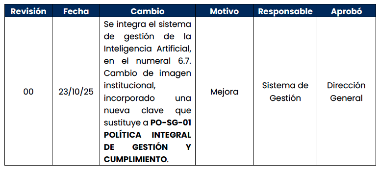 •Revisión anual de la política integral: La Alta Dirección revisará de manera formal la política integral al menos una vez al año, con el objetivo de confirmar su pertinencia, eficacia y alineación con los valores corporativos, la estrategia institucional y las mejores prácticas internacionales.